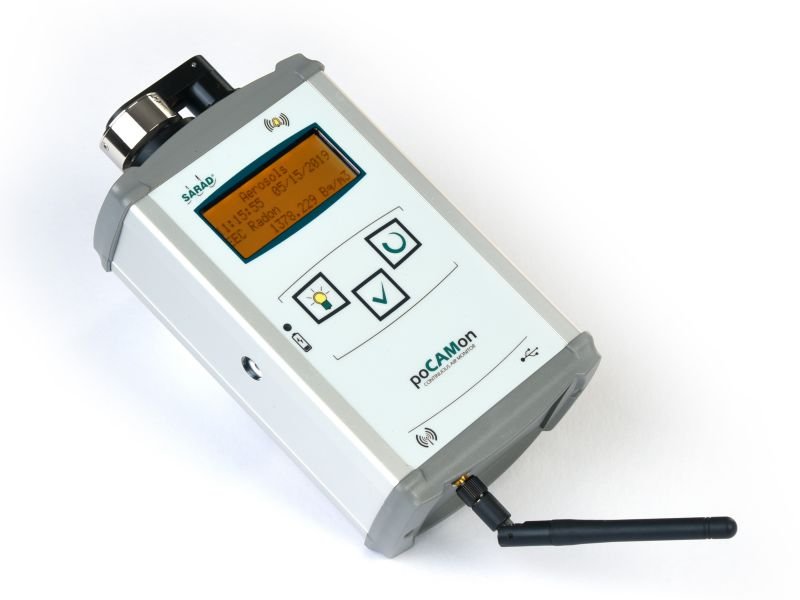 The poCAMon (personal online Continuous Air Monitor) is part of the personal protective equipment used by firefighters and other emergency responders in mines and during environmental disasters. It is ideal for monitoring workplaces in nuclear facilities according to DIN ISO 16639 (VDE 0493-1-6639). The device measures both long-lived aerosols and short-lived radon decay products using alpha spectroscopy and beta counting.